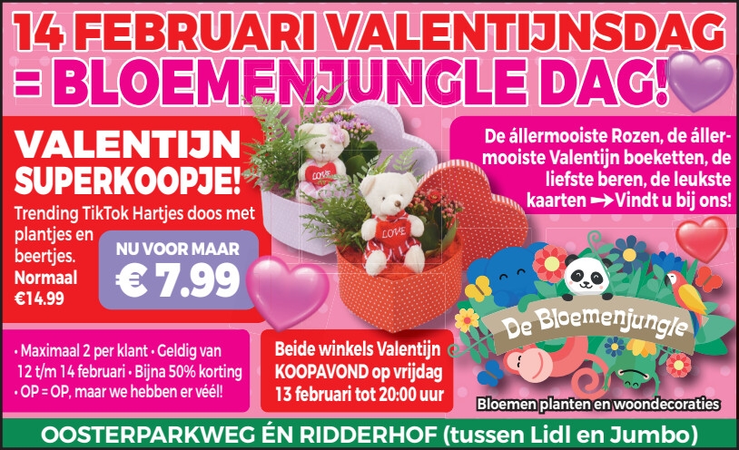 LET OP! IN VERBAND MET VALENTIJNSDAG ZATERDAG 14 FEBRUARI HEBBEN WIJ OP VRIJDAG 13 FEBRUARI KOOPAVOND OP DE OOSTERPARKWEG ÉN RIDDERHOF.