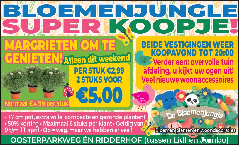 De Bloemenjungle is een bloemenwinkel met het formaat van een tuincentrum waar het nog draait om VERS! Geen stoeptegels, tuinhout, regenjassen etc. maar kersverse snijbloemen en (tuin) planten van de allerhoogste kwaliteit tegen de aller scherpste prijs. Dagelijks hebben wij verse aanvoer van de veiling, verser en van betere kwaliteit kan niet.