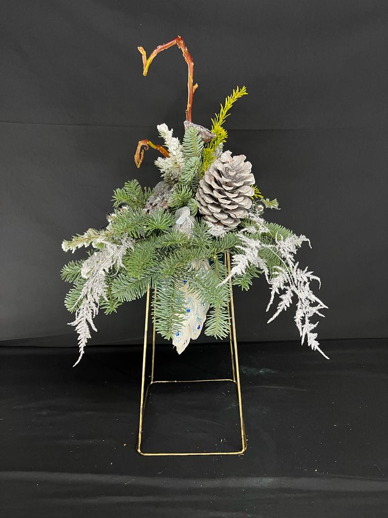 Dit kerststuk word opgemaakt met diverse soorten groen en kerstdecoratie. Wilt u liever een andere kleur decoratie geef dit dan aan in de opmerkingen. Wij proberen altijd zoveel mogelijk de foto na te maken, echter omdat niet alles standaard op voorraad is is de kerstdecoratie zoals de foto onder voorbehoud.